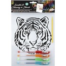 Balenie obsahuje 2 šablóny - kone a tigra A5, biele papiere na obkresľovanie a čierne a vyškrabovanie. Vek 3+